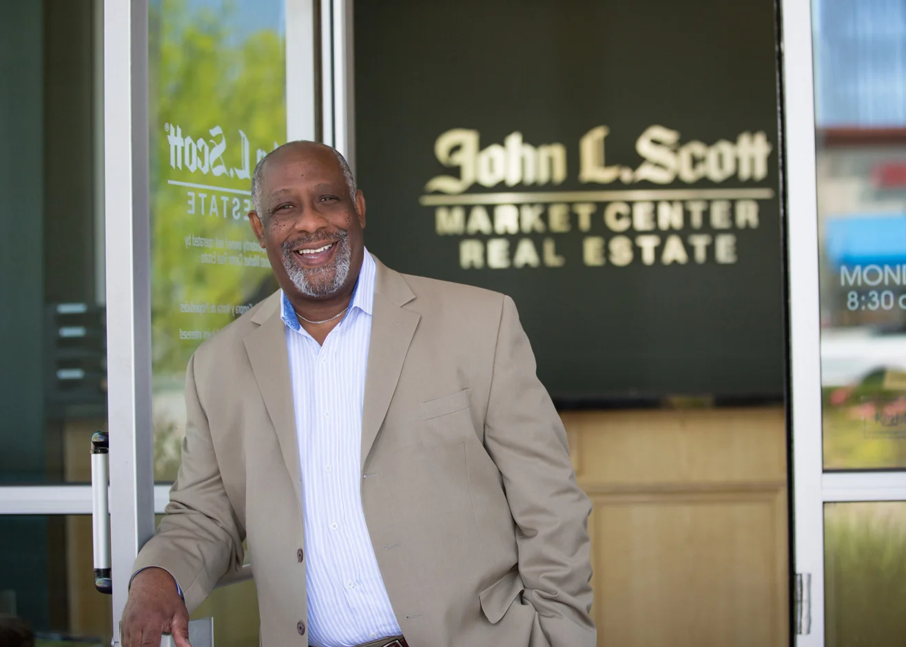Man in beige suit standing outside a real estate office with "John L. Scott Market Center Real Estate" sign in the background.