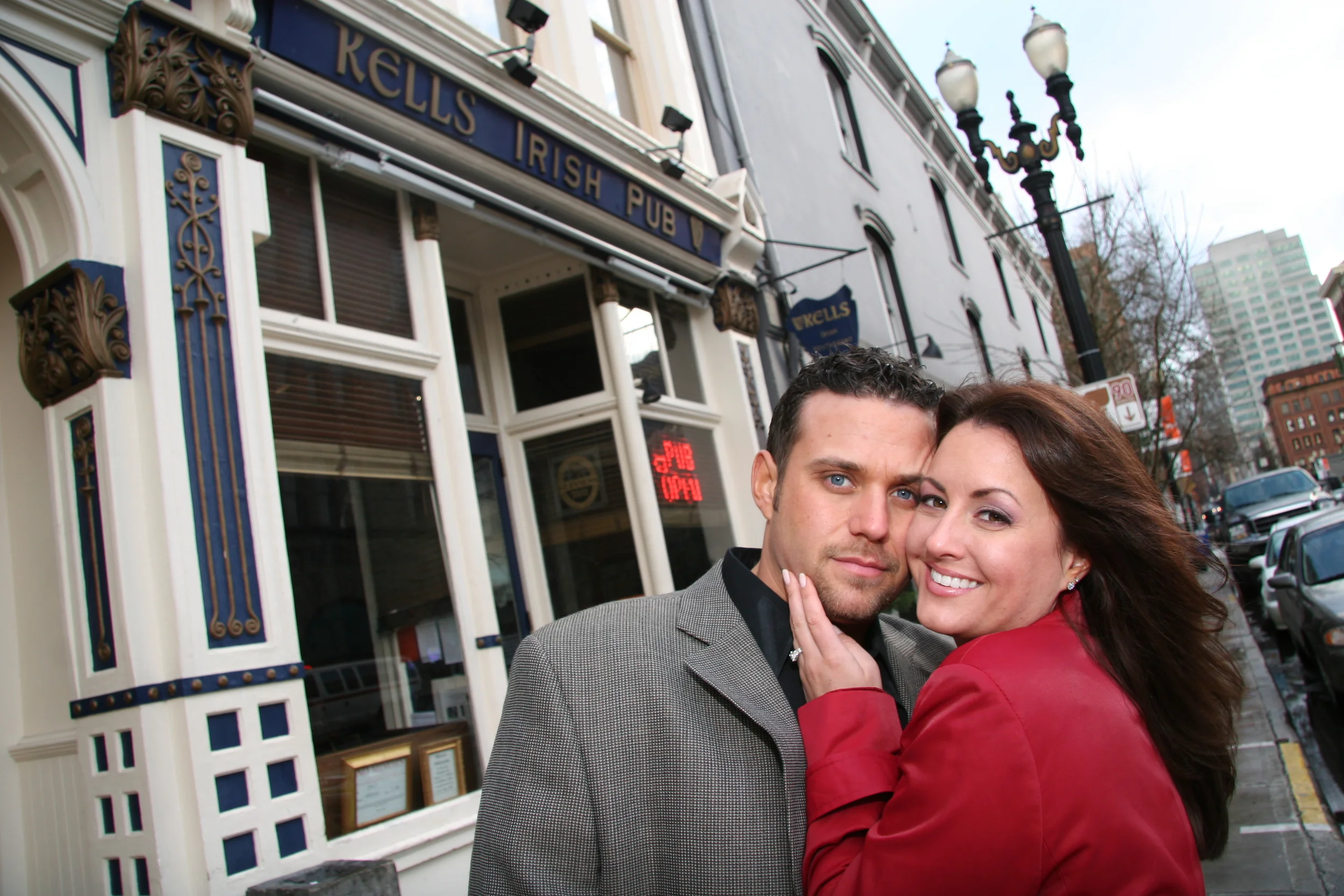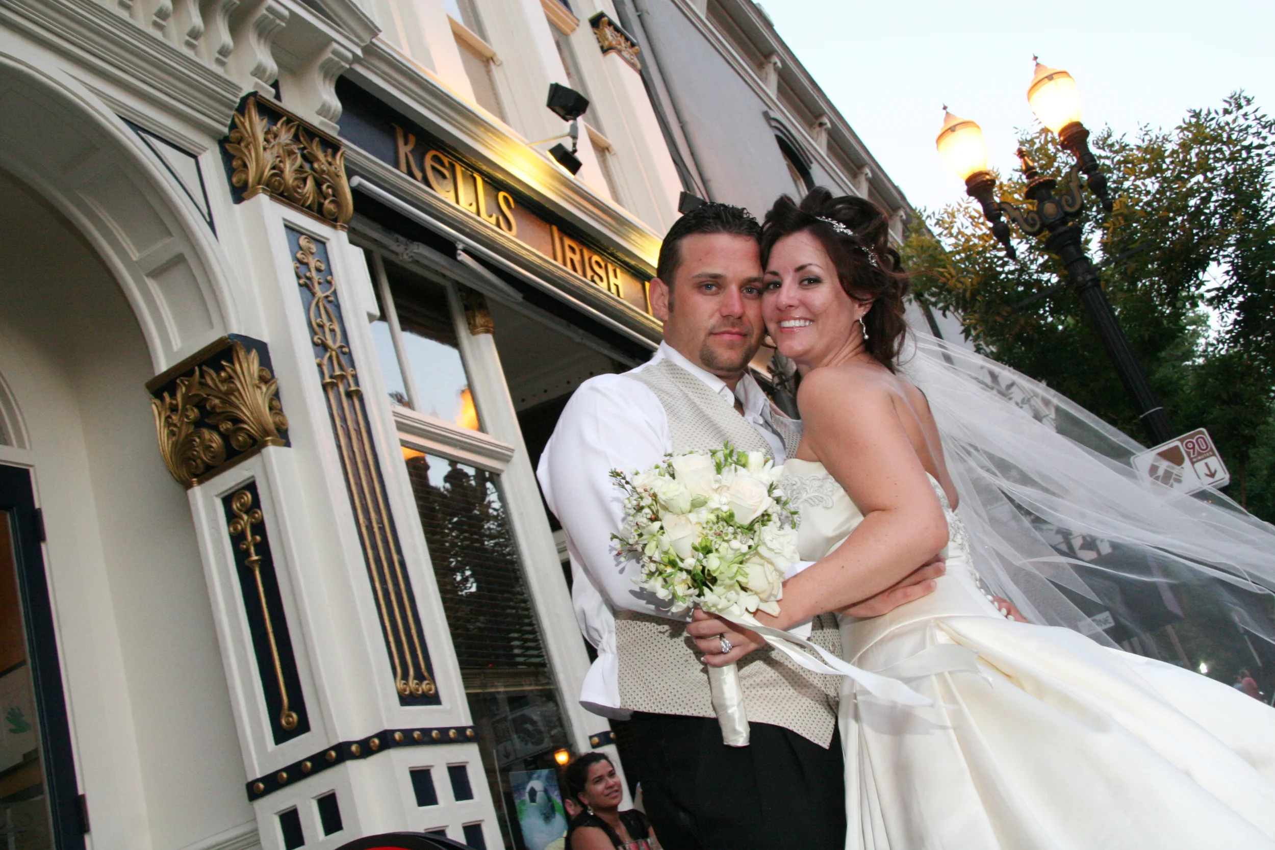 Bride and groom outside Kells Irish Pub with bouquet and wedding dress.