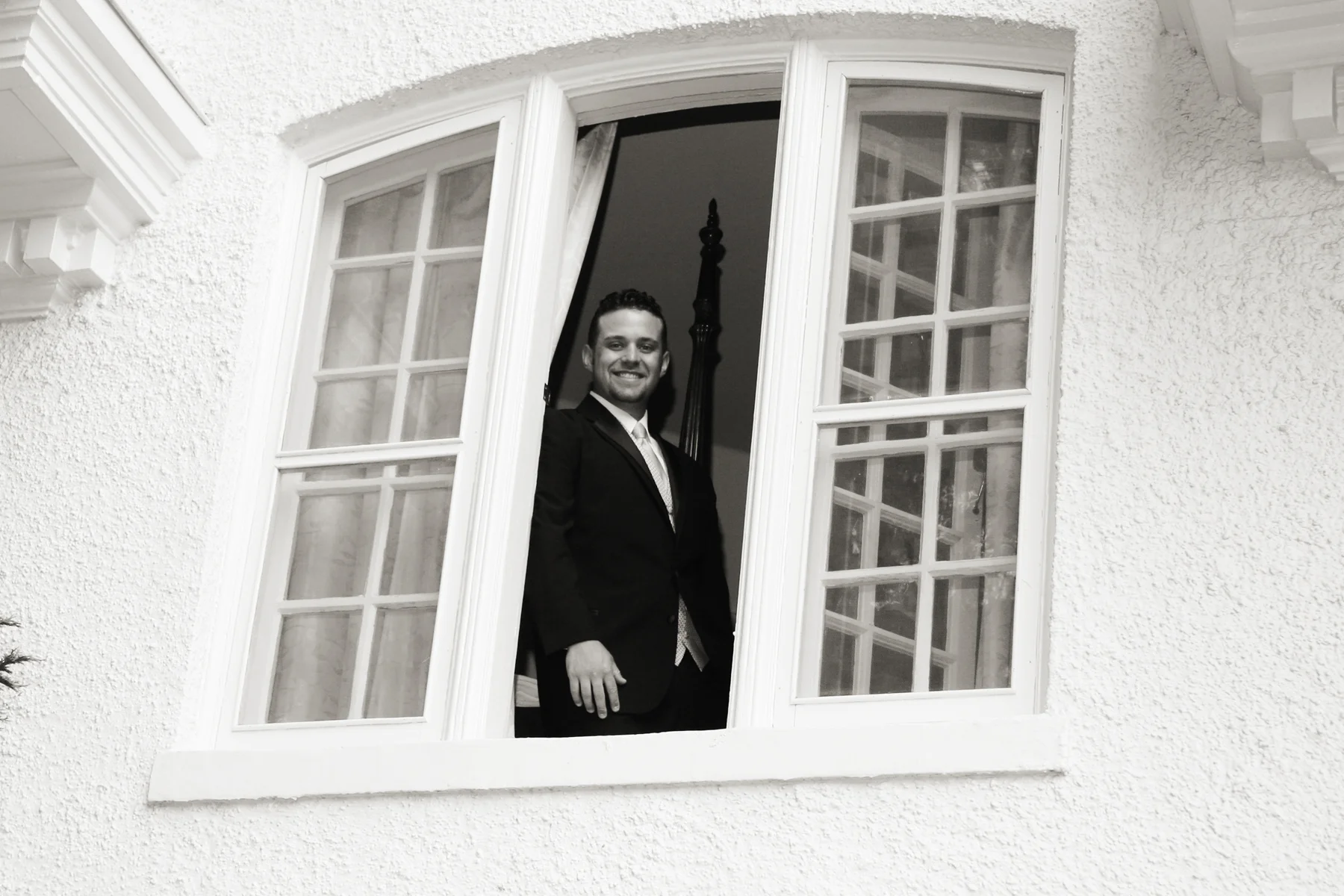 A bride and groom stand smiling in front of a large window as two boys in white shirts with red suspenders blow bubbles towards them during a wedding ceremony.