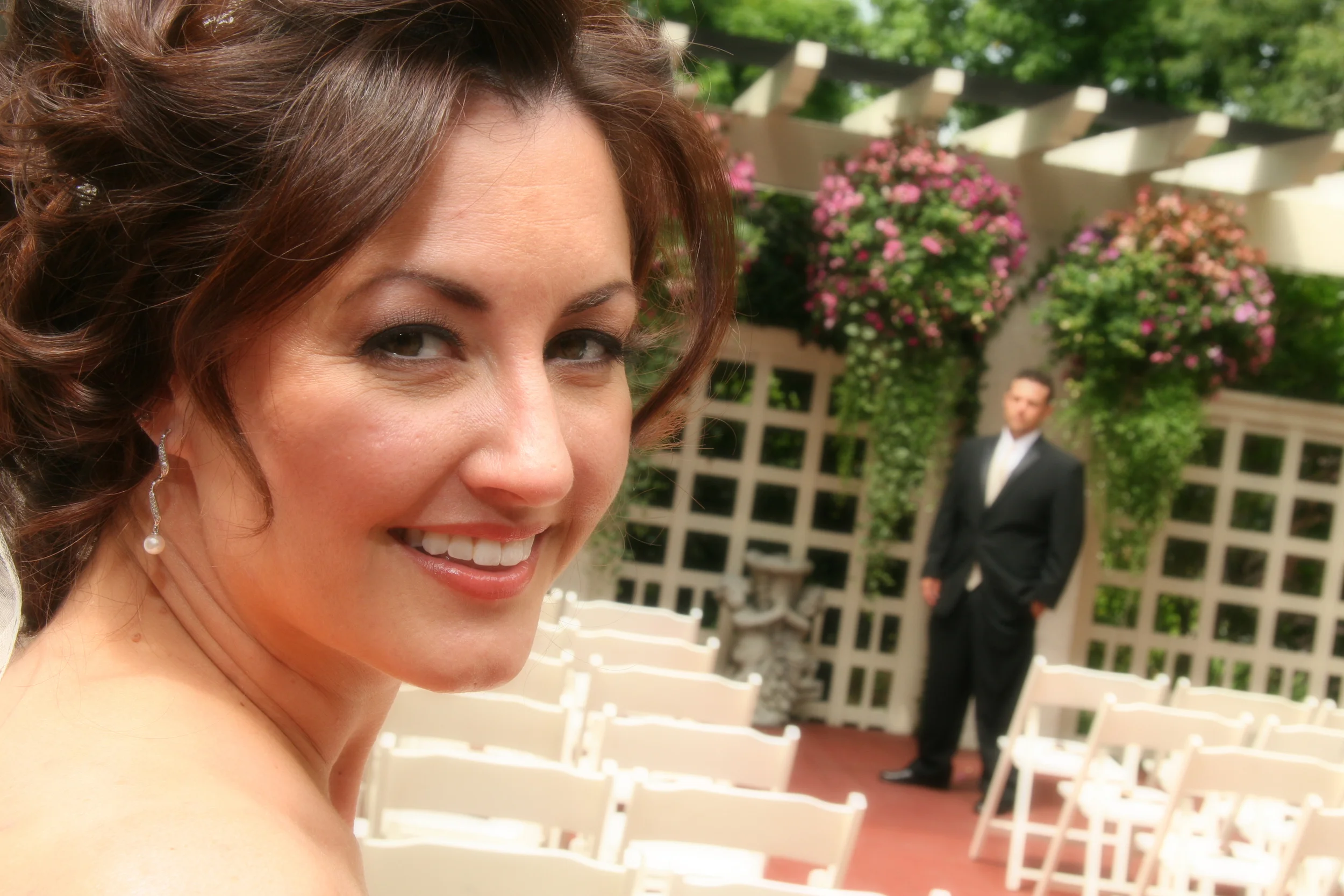 Smiling woman with groom in background at outdoor wedding venue with white chairs and floral decorations.