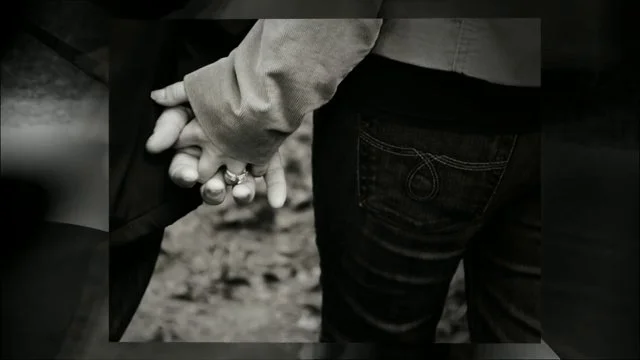Black and white photo of a couple walking on a city street holding hands, with buildings and cars in the background.